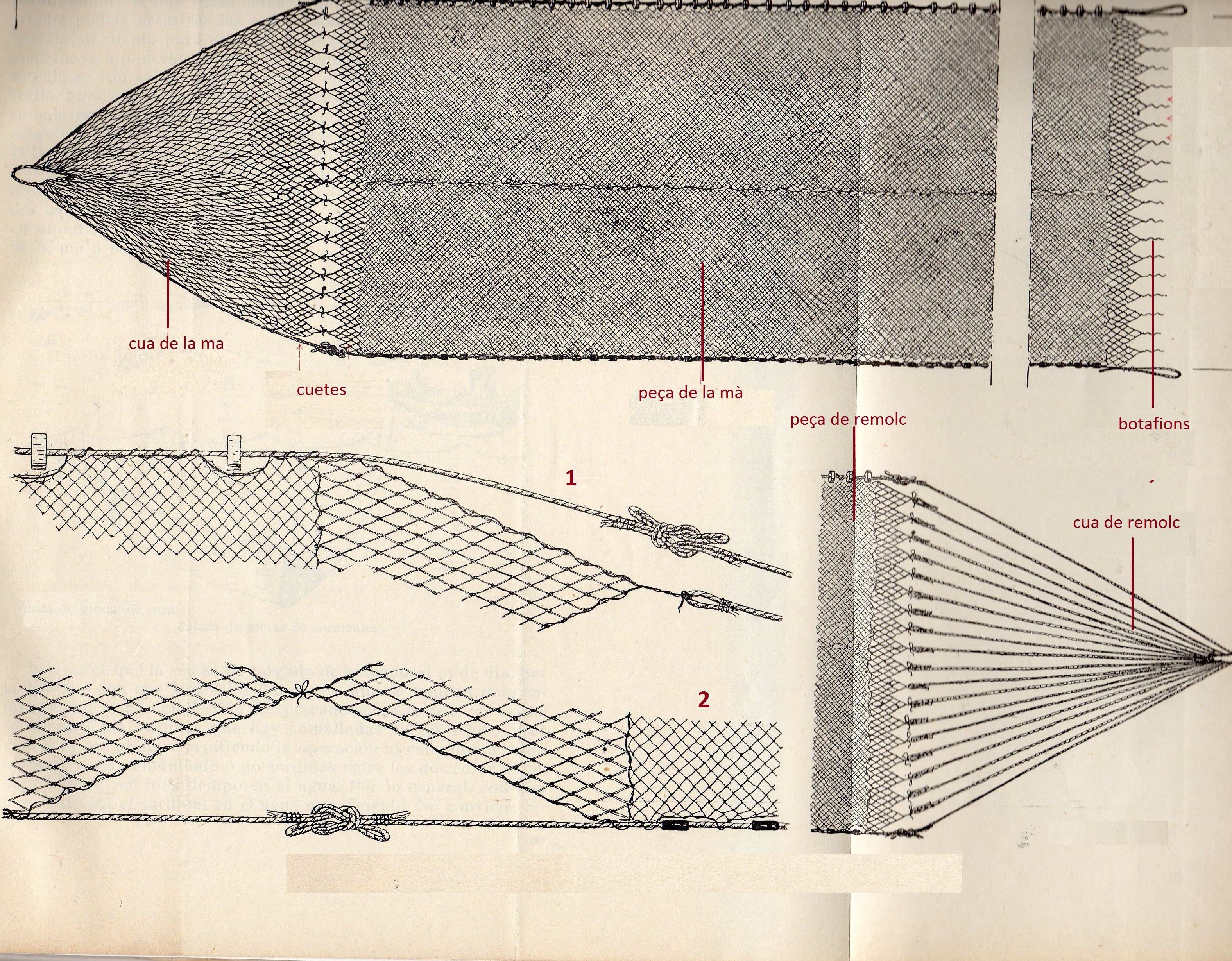Esquema de les parts d´un sardinal i detall de la unió amb la cua de remolc (1) i amb la cua de la mà (2). Font: elaboració propia a partir d´un original de C: Bas i altres.