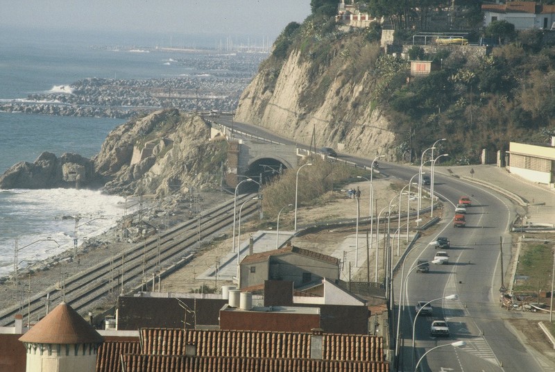 La intensa ocupació de la façana litoral provoca problemes en el manteniment de les infraestructures costaneres. Tram de costa a Arenys de mar ocupat per la carretera N-2 i la via del tren