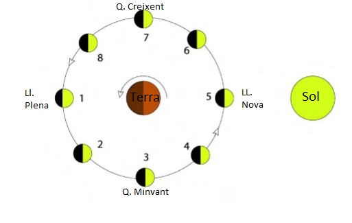 Fases del cicle lunar. En les posicions 1 i 5 les forces exercides per la Lluna i el Sol es sumen i es produeixen les marees vives. En les posicions 3 i 7 les forces gravitatòries es compensen i donen lloc a les marees mortes.